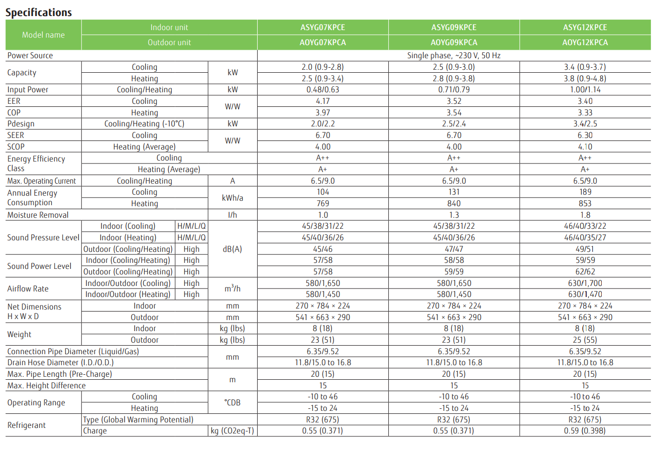 A Fujitsu ASYG07KPCE / AOYG07KPCA általános szerelési információi: