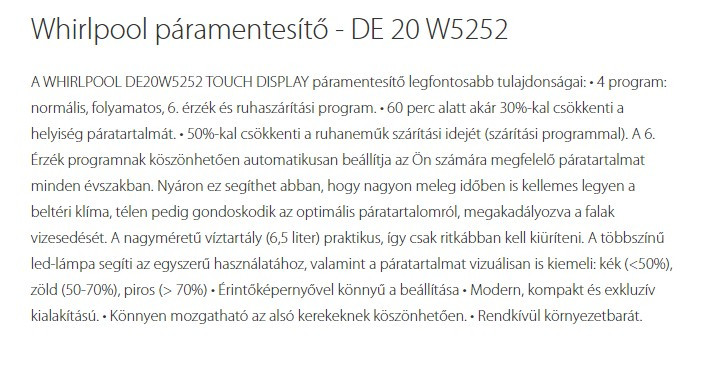 A Whirlpool DE 20 W5252 Párátlanító készülék 20 liter/nap fontos tulajdonságai: